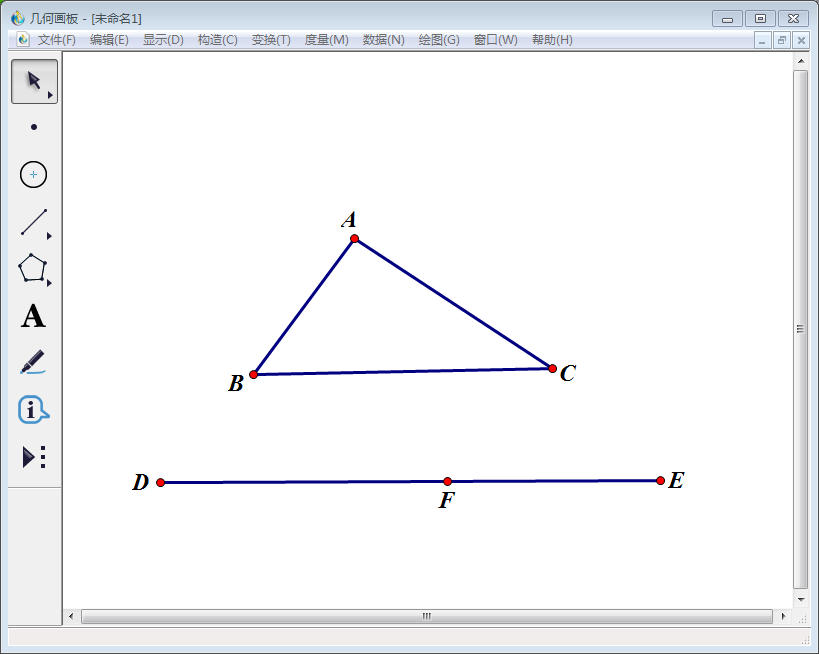 2、点击左侧工具栏中【线段直尺工具】在三角形ABC外画一条线段,使用【文本工具】将端点标记为D、E;使用【点工具】在DE上点任一点,标记为F。
