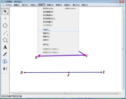 4、使用【移动箭头工具】选中三角形ABC的三条边和三个顶点,接着点击【变换】,然后在其下拉菜单下点击【平移】。
