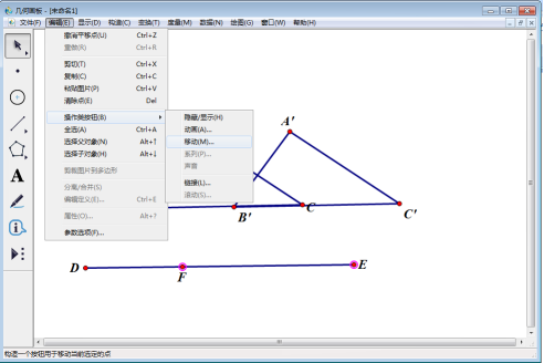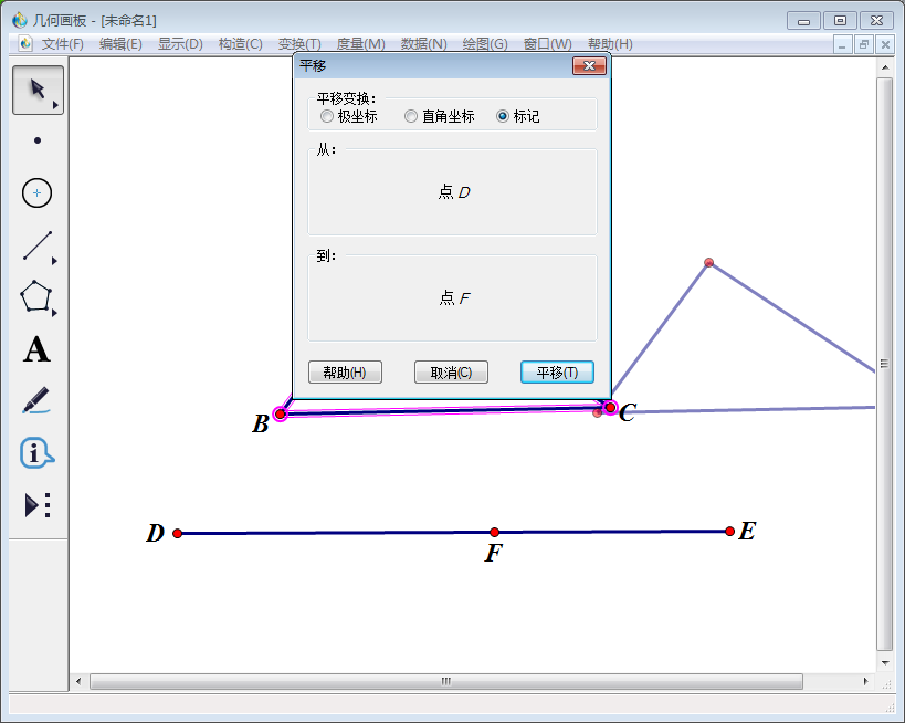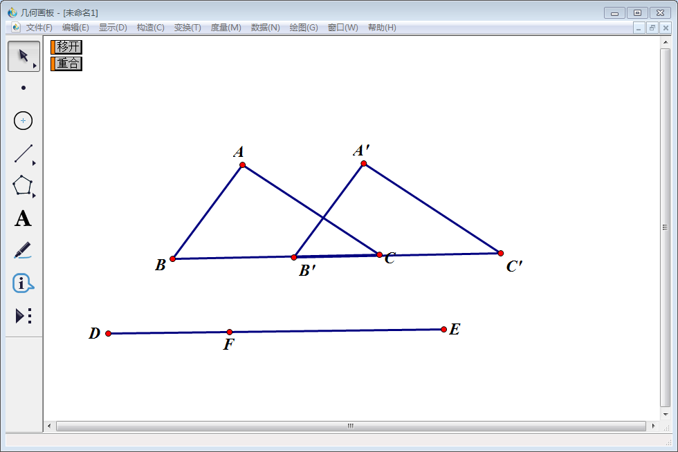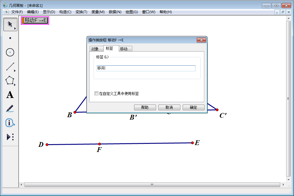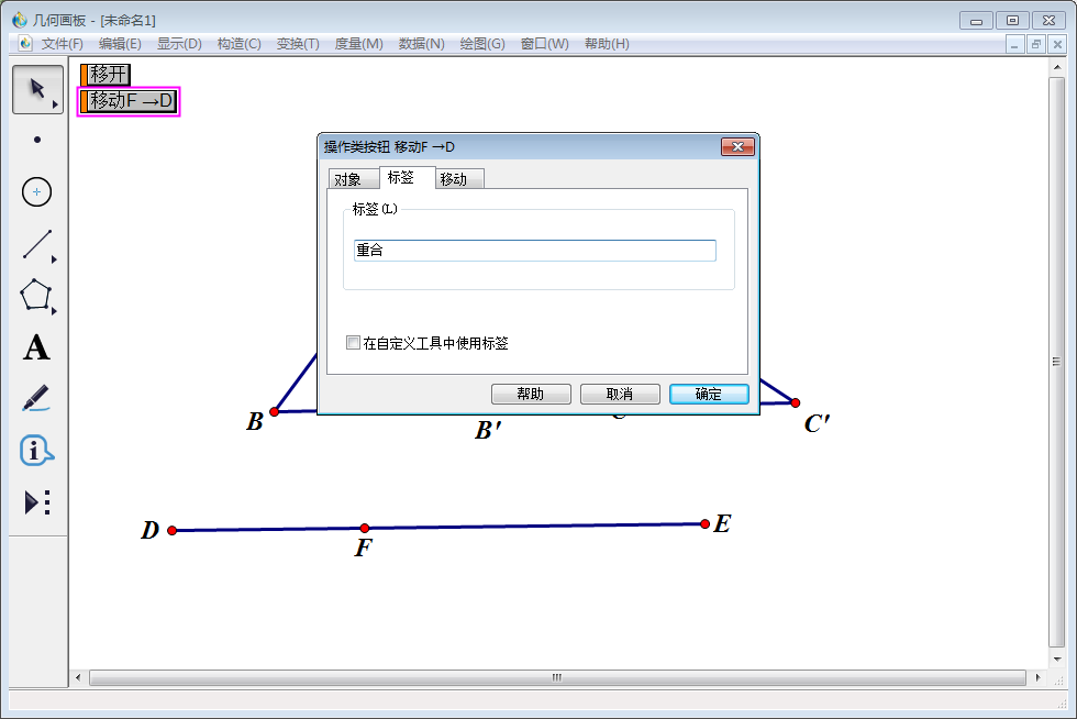 依次选中点F、D,然后点击【编辑】—【操作类按钮】—【移动】,修改弹出窗口中标签名称(输入“重合”),单击【确定】。