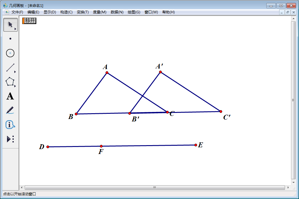 7、拖动点F点,可以看到三角形A\'、B\'、C\'与三角形ABC位置发生变化。当F点与D点重合时,两个三角形位置重合。