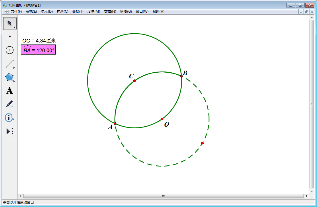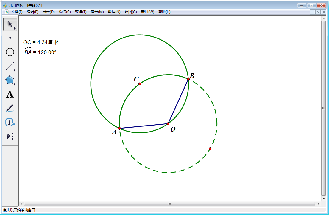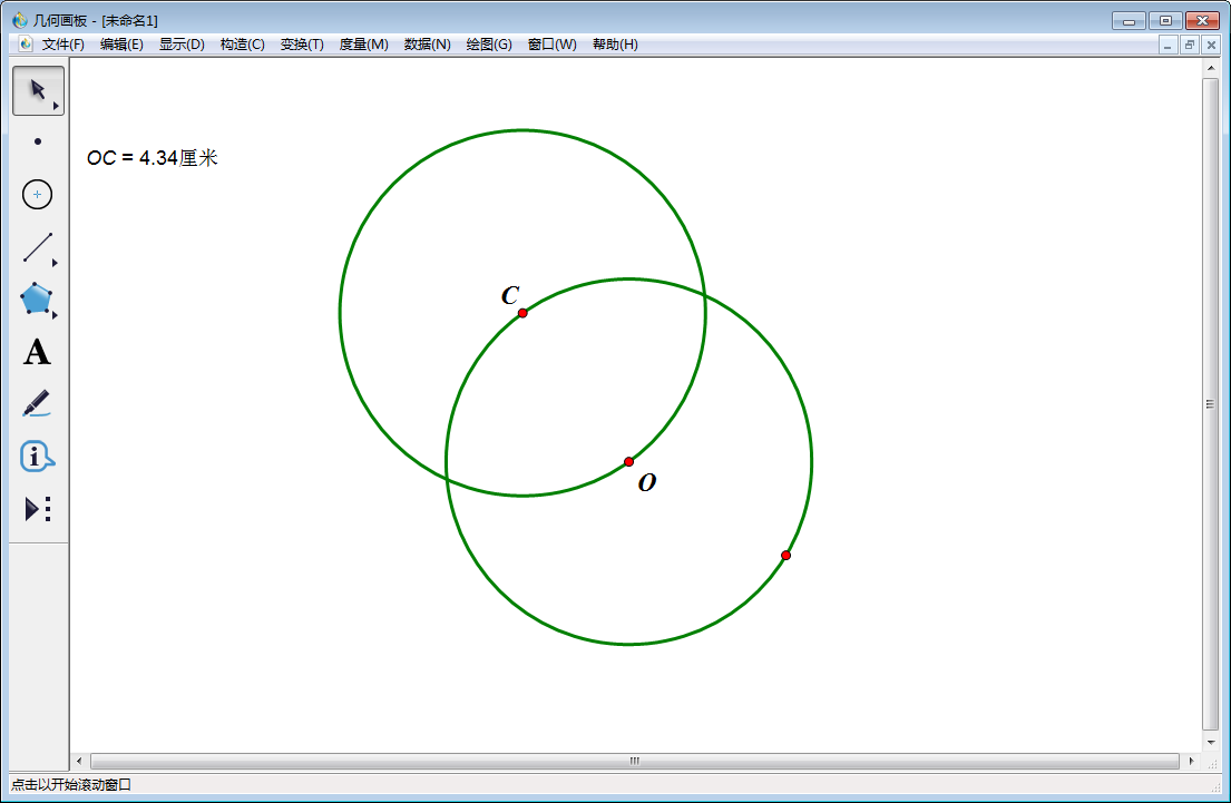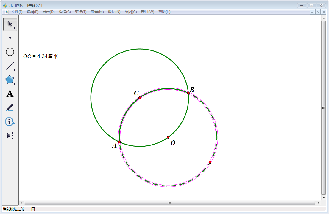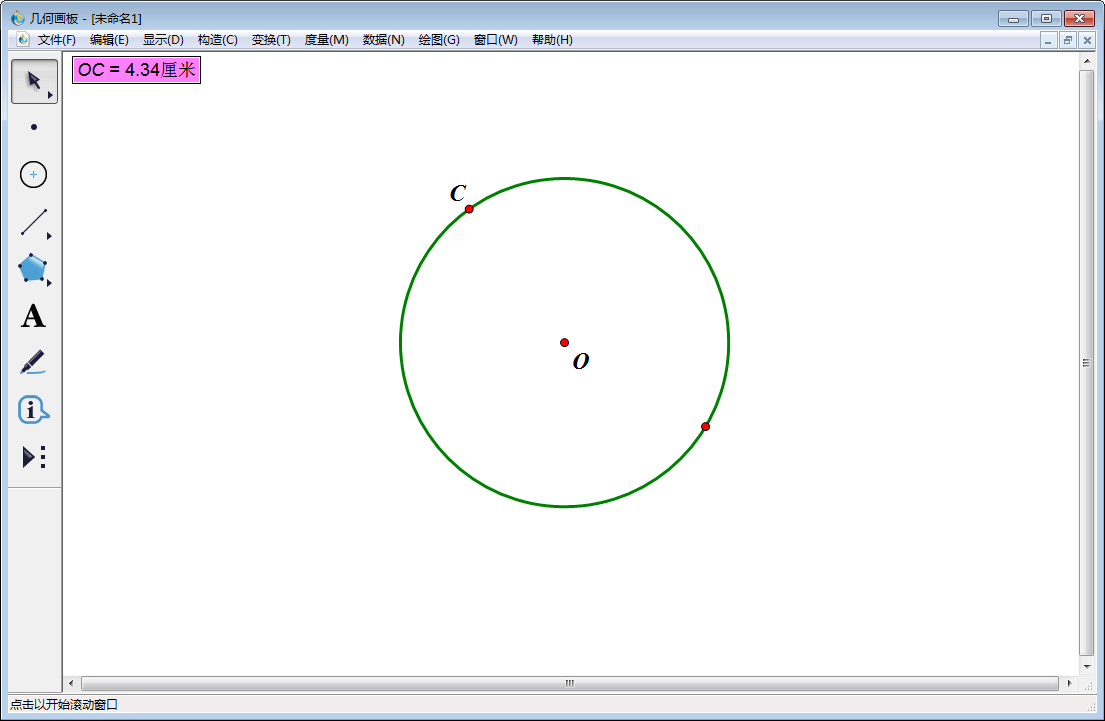 4、使用【移动箭头工具】选中C点和计量OC(即OC=4.34),然后点击上方菜单栏中的【构造】,在其下拉菜单中选择【以圆心和半径绘圆】。