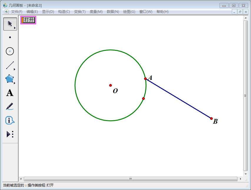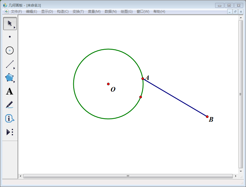 2、使用左侧工具栏中【点工具】在圆上任取一点,标记为A点。然后使用左侧工具栏中的【线段直尺工具】从A点往圆外任意做一条线段,另一端点标记为B点。
