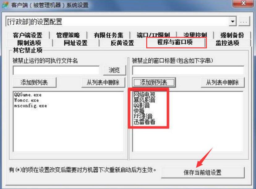 3、企业管理员想用WorkWin禁止员工利用局域网看电影视频,还可以切换到“程序与窗口项”的设置界面。将常用的播放软件添加至列表中,让用户不能利用局域网资源在线看电影视频。