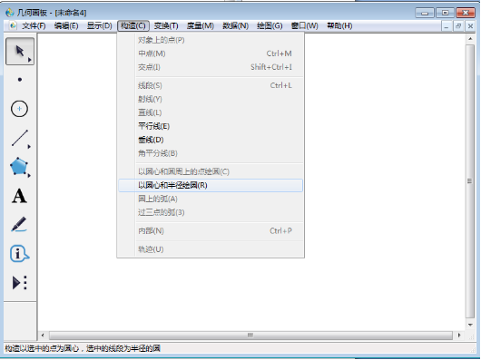 2、点击左侧工具栏中的【移动箭头工具】选中线段AB、点A、点B。然后点击上方选择菜单栏中的【构造】,在其下拉菜单中选择【以圆心和半径绘圆】。