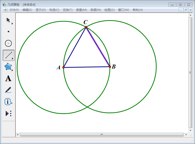 3、得到圆A、圆B两个圆,它们的半径为AB,圆心分别为A、B。使用左侧工具栏中的【点工具】标出两圆的一个交点,使用【文本工具】标记为C,使用【线段直尺工具】连接AC、BC。