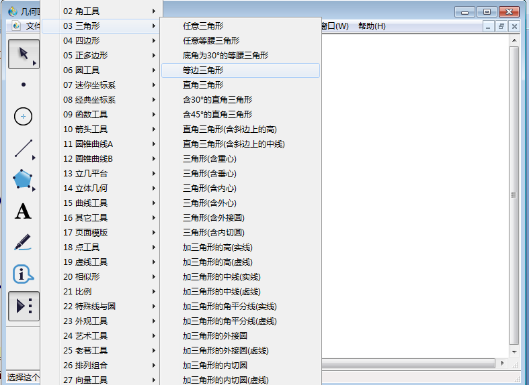 5、当然,以上画法主要是为了加深对几何画板的理解。熟练的用户也可以点击左侧工具栏中的【自定义工具】,在其下拉菜单中选择【三角形】—【等边三角形】,直接将正三角形调用到空白画板上。