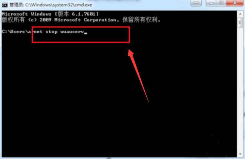 2、此时,便会出现cmd的命令提示操作界面,在如下图的位置输入“net stop wuauserv”并且按下电脑回车键。