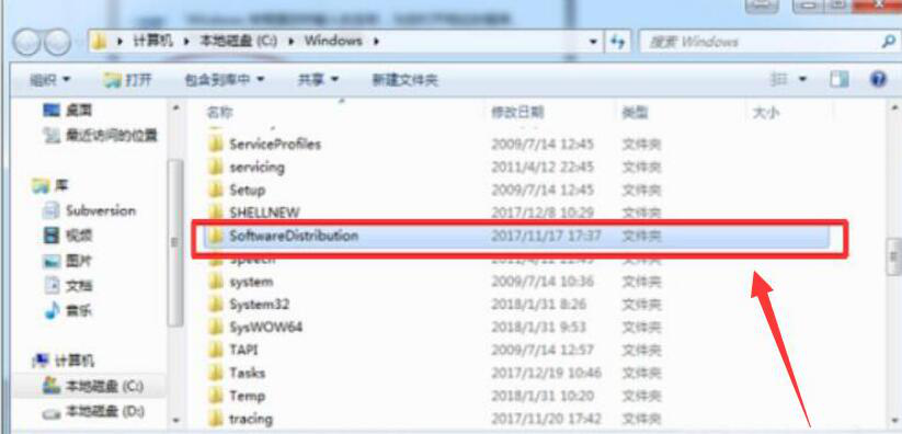 4、接下来,打开电脑C盘,找到“SoftwareDistribution”文件夹,右键将其命名为“SDold”。