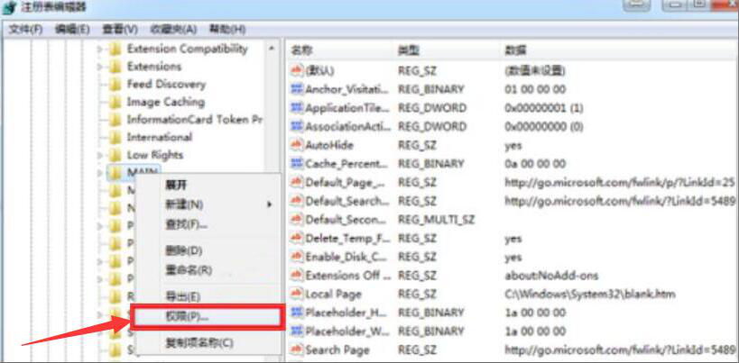 7、进入注册表编辑器,在其界面左侧找到“MAIN”文件夹。右键单击该文件夹,在弹出来的菜单中点击“权限”。