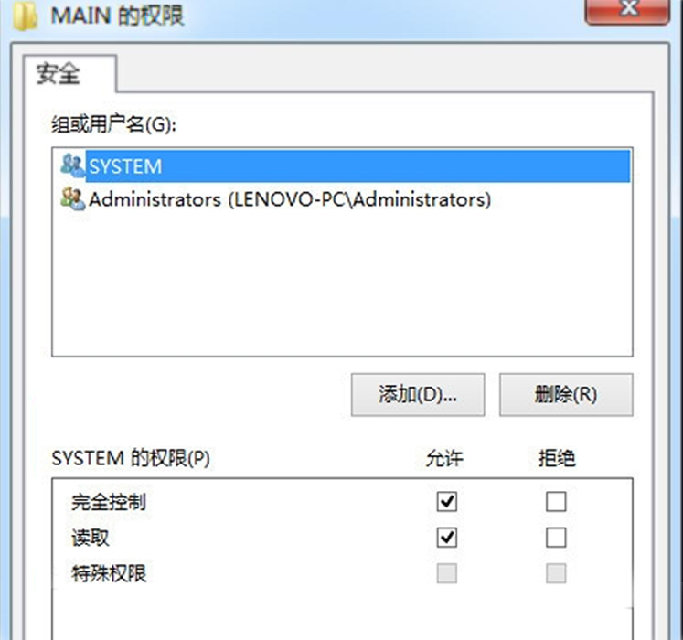 8、最后,用户在MAIN的权限窗口中修改SYSTEM的权限,勾选允许“完全控制”、“读取”这两项内容。设置完成后,将电脑重启即可解决net framework 4.0安装失败的问题。