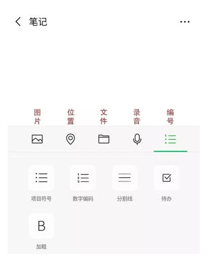 点击上方【+】,如图,现在你可以开始写笔记,下方一共有五个工具,小编进行了标注,从左到右依次是图片/视频、定位、文件、录音、编号,