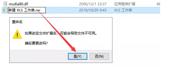 找到已经加密的Excel文件,鼠标右击,选择重命名,将其后缀修改为rar,弹出提示窗口,点击【是】,