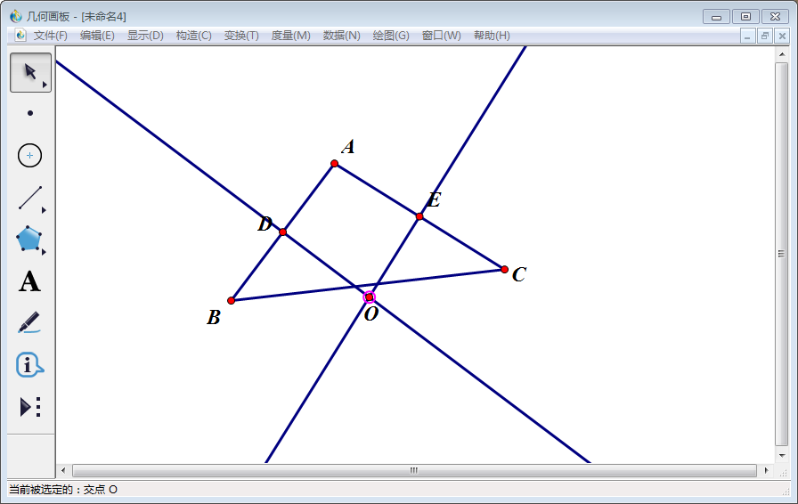7、同上步操作得到线段AC的中垂线。使用【点工具】画两条垂线的交点,使用【文本工具】将该交点标为O。