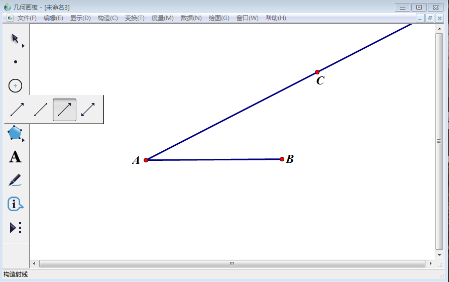 2、使用【线段直尺工具】以点A为端点做射线,射线上的点使用【文本工具】标为C点。
