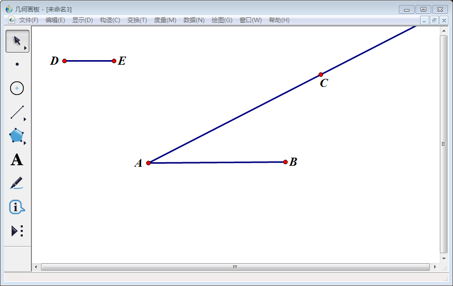 3、使用【线段直尺工具】,在空白处任意画一条线段,两个端点使用【文本工具】分别标为D、E。