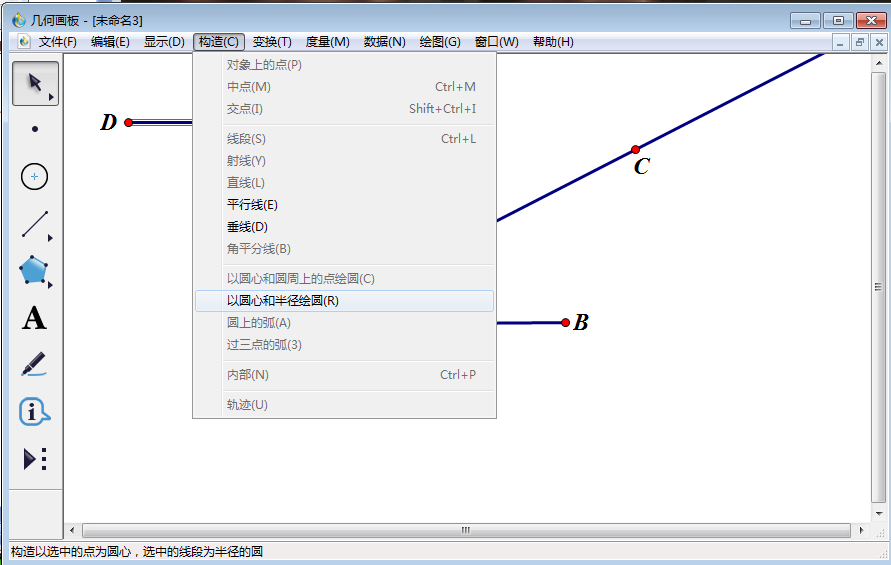 4、点击左侧工具栏中的【移动箭头工具】选中点A和线段DE,然后点击上方菜单栏中的【构造】,在其下拉菜单中点击【以圆心和半径绘圆】,得到以A为圆心,DE线段长为半径的圆。
