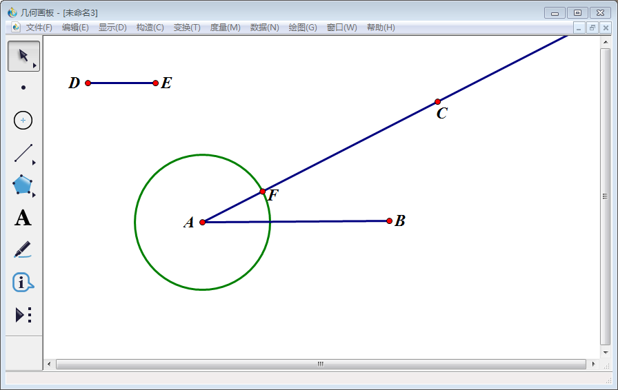 5、使用左侧工具栏中【点工具】画圆A与射线AC的交点,使用【文本工具】将该交点标为F。