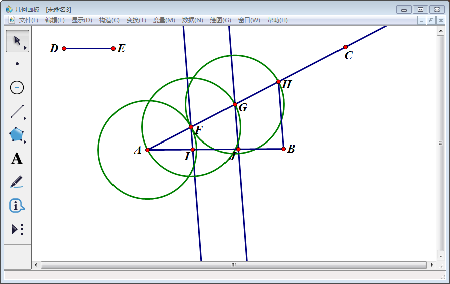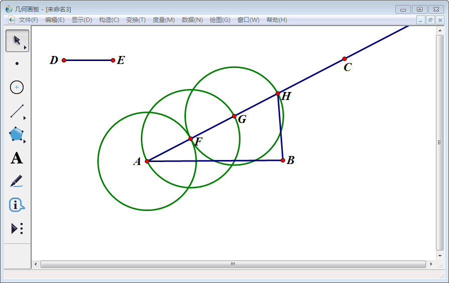 6、同第4、5步一样的操作,先画以F为圆心,以线段DE为半径的圆F,圆F与AC的交点标为G;然后画以G为圆心,以线段DE为半径的圆G,圆G与与AC的交点标为H。