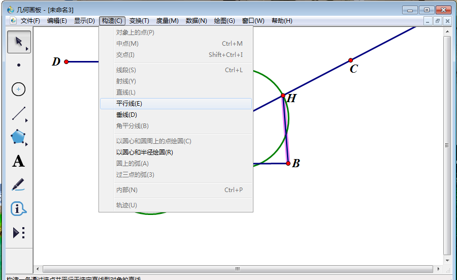 8、使用【移动箭头工具】选中点F和线段BH,然后点击【构造】,在其下拉菜单中点击【平行线】,得到过点F与线段BH的平行线。