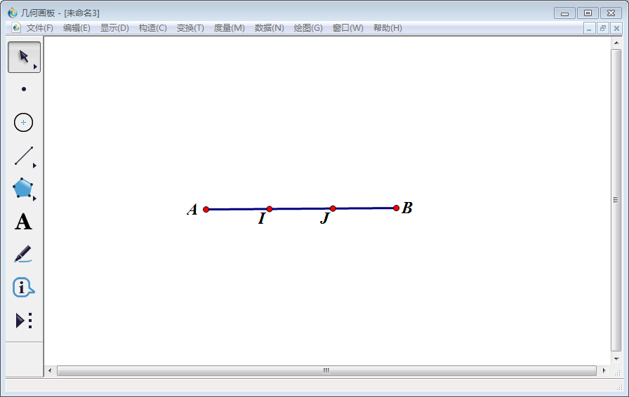 1、打开几何画板,点击左侧工具栏中的【线段直尺工具】,在空白画板上任意画一条线段,点击左侧工具栏中的【文本工具】将该线段两个端点标记为A、B。线段AB就是需要三等分的线段。