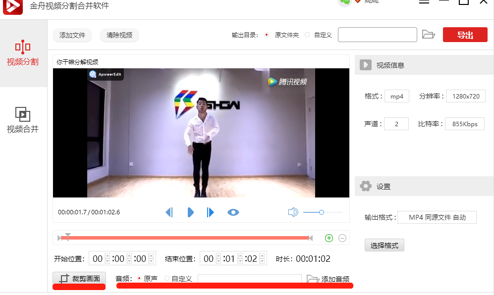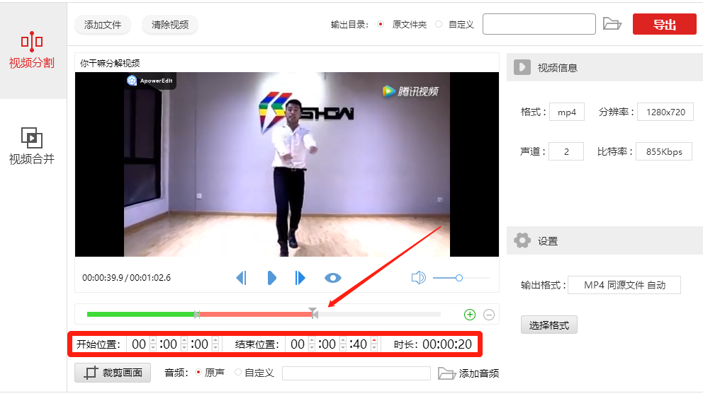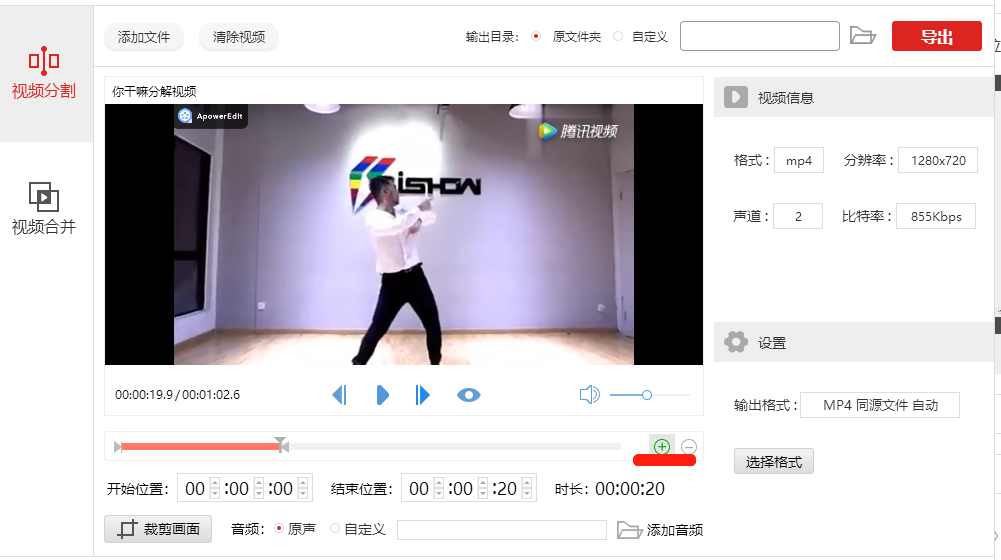 设置完成,点击右下角的【选择格式】,弹出窗口,将视频文件导出保存为MP4格式,点击【同源文件】,