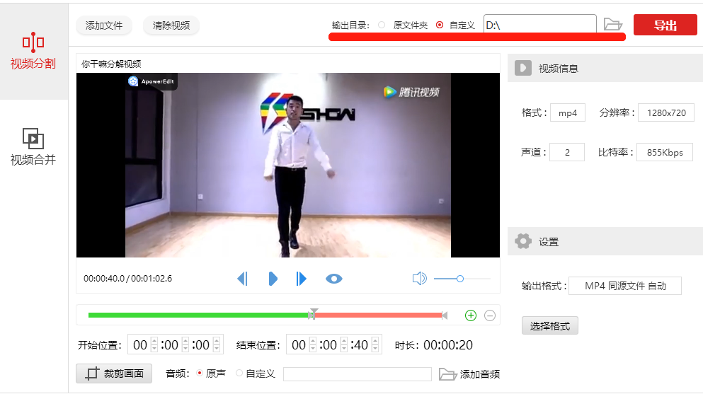 现在点击【输出目录】,选择【自定义】,打开文件夹,设置视频文件输出保存路径,最后点击【导出】即可。