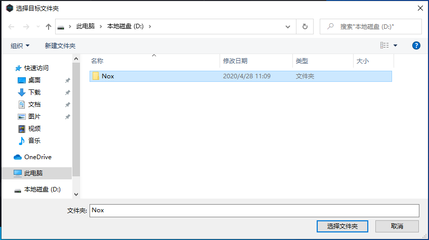 3、弹出选择目标文件夹窗口,浏览要迁移到的目标文件夹,然后点击【选择文件夹】。注意:要保证目标文件夹所在硬盘的可用空间大于原模拟器数据文件的所占实际空间。