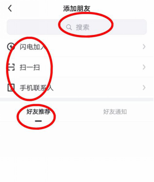 3、进入添加朋友界面,在该界面中我们可以看到添加好友的方式:闪电加人、扫一扫、手机联系人、好友推荐。