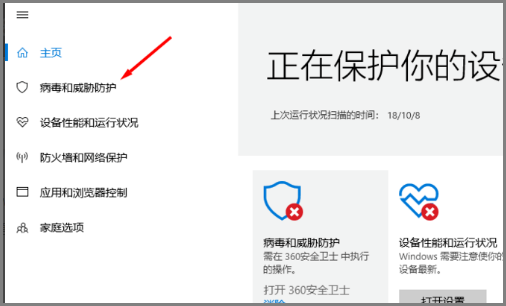 进入Defender主页,如图,在左侧点击【病毒和内威胁防护】,找到【病毒和威胁防护设置】,点击它,