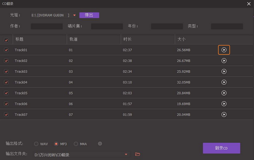 点击【CD翻录】,此时会弹出一个窗口,提示插入CD,将CD连接到电脑,这里会显示所有音频文件,选择需要转换的音频文件,单击播放按钮,进行预览,