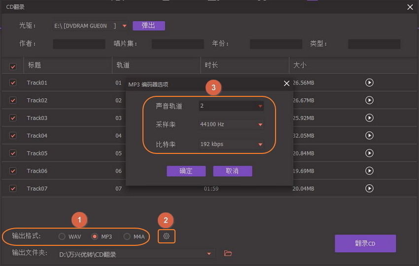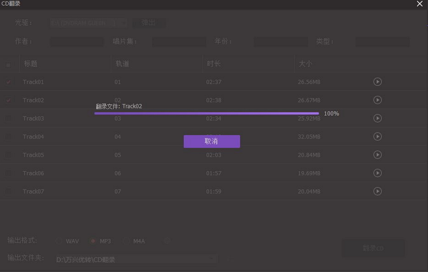 点击【输出文件夹】,设置文件保存路径,最后点击【翻录CD】,即可将CD转换到音频文件,