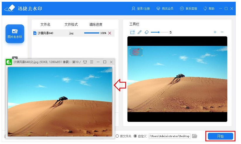 最后点击【开始】,软件就会自动去除图片水印,处理完成,在目标路径中找到无水印图片。