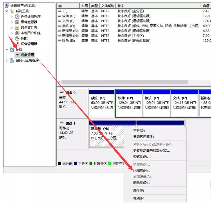 进入计算机管理窗口,如图,在左侧点击【存储】——【磁盘管理】,然后在右侧找到U盘,在没有加密的分区上方点击右键,弹出菜单,选择【压缩卷】,