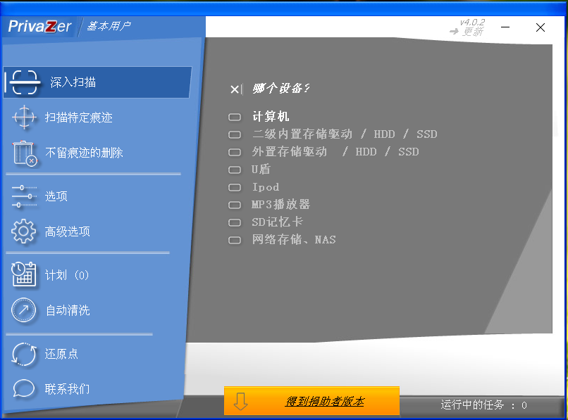 Privazer支持多种设备的深度扫描清理:计算机、二级内置存储驱动/HDD/SSD、外置存储驱动/HDD/SSD、U盾、IpoD、MP3播放器、SD记忆卡、网络存储/NAS。