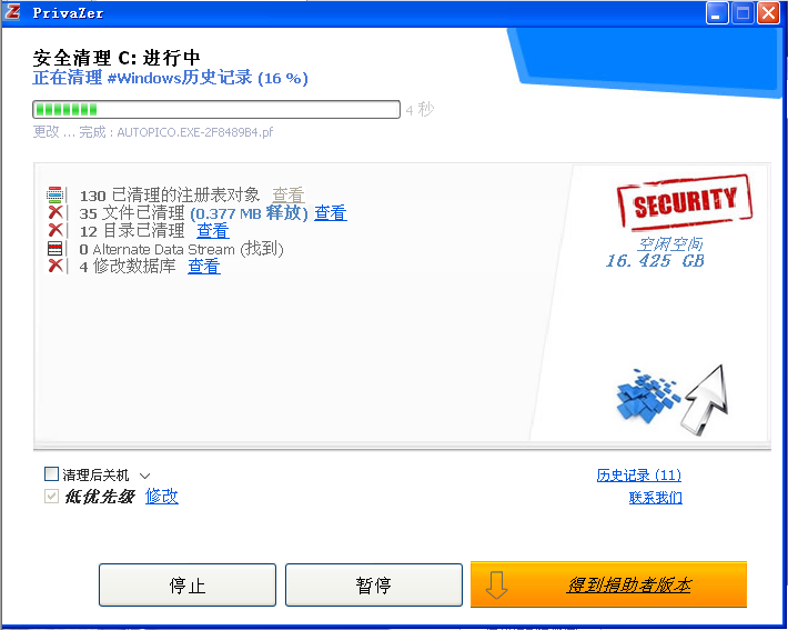 6、开始安全清理,初次清理时间较长,需耐心等待,清理过程中可以随时点击【暂停】或【停止】。