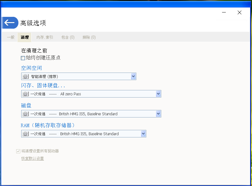 2、在高级选项界面,用户可根据需要点击“一般”、“清理”、“内存、索引”、“包含”、“排除”,对是否设置还原点、清理方式等进行自行选择。