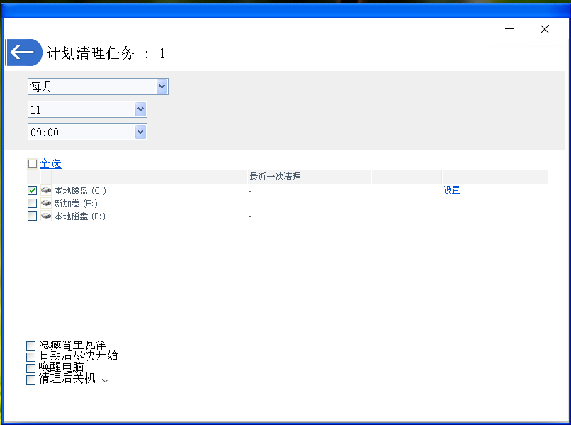 2、在计划清理任务界面,首先设定定时清理的频率,这里选择“每月”,然后设定清理任务的具体时间,比如这里设定为每月的11日9点,最后选择要定时清理的磁盘设备。设置完成后点击左上方箭头返回软件主界面。