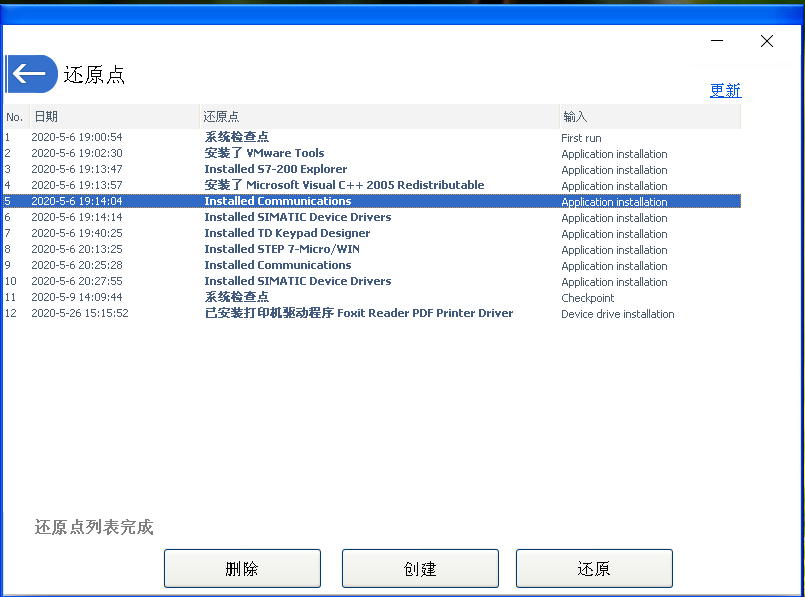 2、选择还原点。点击【创建】或【还原】。