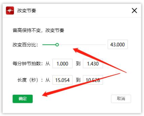 弹出窗口,如图,你可以通过拖动滑块来改变百分比,从而调整音频节奏,小编是将原来的1个节拍变成了1.43个 节拍数,15秒的音频缩短成10秒,然后点击确定,