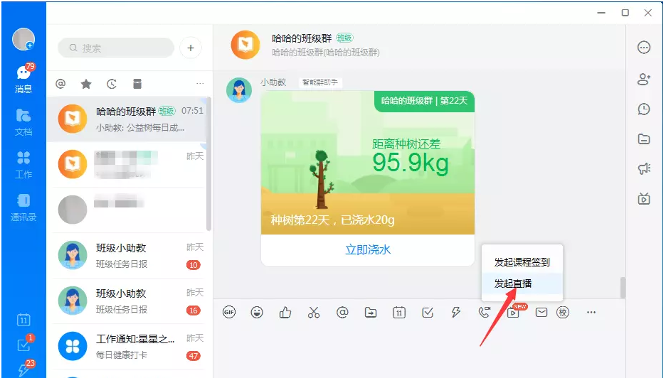 点击进入群聊窗口,如图,选择工具栏中的【发起直播】功能,出现选项,点击【发起直播】,