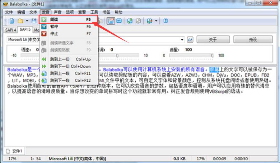 3、设置完成,点击balabolka菜单栏“发音”中的“朗读”,便可以试听语音效果。用户根据自己想要的听觉效果,调试语速、语调、音量。