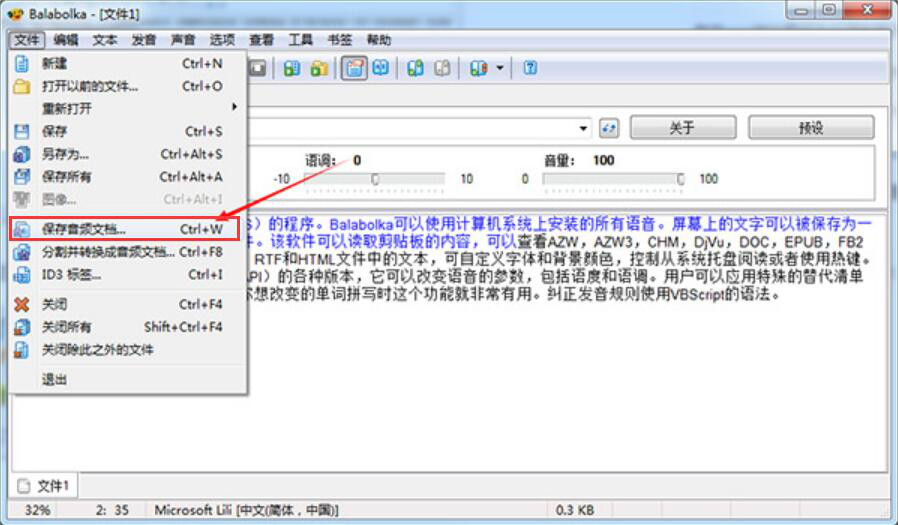 4、接下来,调试完成了,就点击balabolka菜单栏“文件”中的“保存音频文档”。