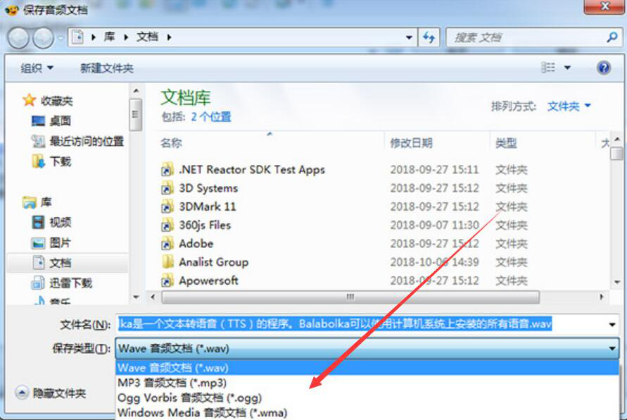 5、此时,便会弹出如下图的“保存音频文档”的窗口,用户根据自己需要,选择输出的音频格式。一般建议选择MP3格式,这样无论在电脑还是在手机都可以正常播放。