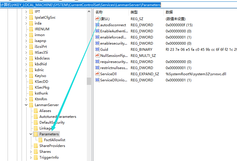 打开注册表编辑器,在左侧栏依次点击展开【HKEY_LOCAL_MACHINE\\SYSTEM\\CurrentControlSet\\Services\\LanmanServer】,找到【Parameters】,