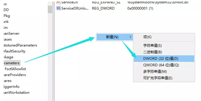 选择【Parameters】,在右侧窗口空白处点击右键,弹出菜单,点击【新建】——【DWORD(32位)值】,设置名称为AutoShareServer,
