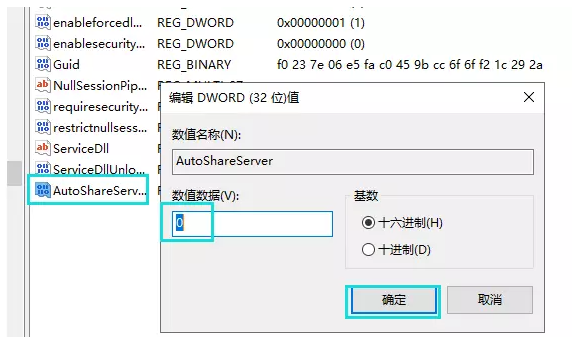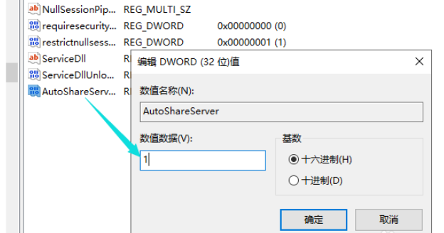 如果允许网络共享,双击打开AutoShareServer,把数值数据修改1,点击确定。