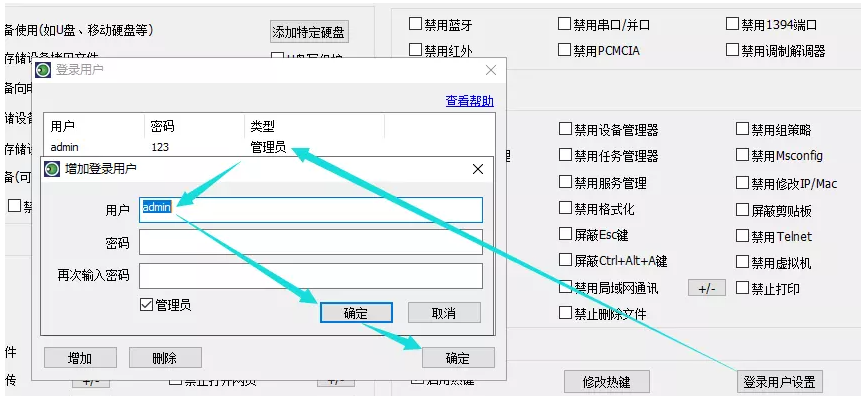 在下方点击【登录用户设置】,弹出窗口,双击打开admin用户,根据提示修改密码,依次点击确定,然后设置软件在后台运行。