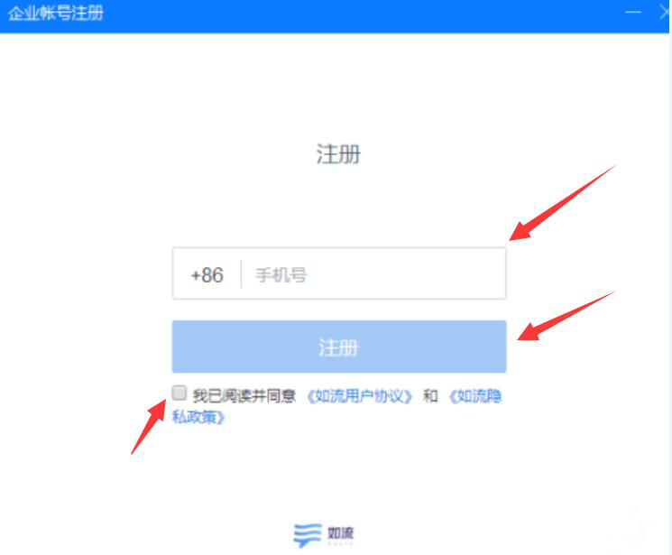 2、然后,进入如流注册的页面,用户正确填写手机号并勾选“我已阅读并同意《如流用户协议》和《如流隐私政策》”,再点击“注册”按钮。