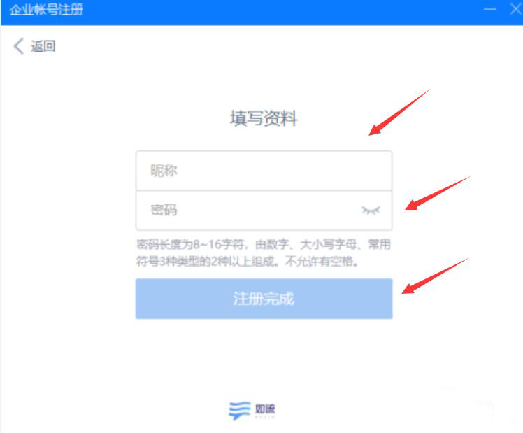 3、接下来,想要成功注册如流账号,还需要完善企业资料。如下图,输入企业昵称、密码,点击“注册完成”按钮。