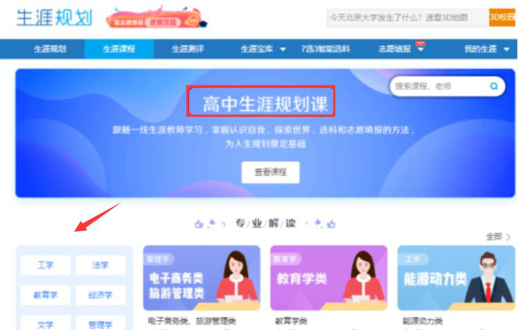 4、此时,在高中生涯规划课的页面,用户可以在其左侧选择不同的专业进行了解比较,从而为后续选择大学专业作出相关的规划。